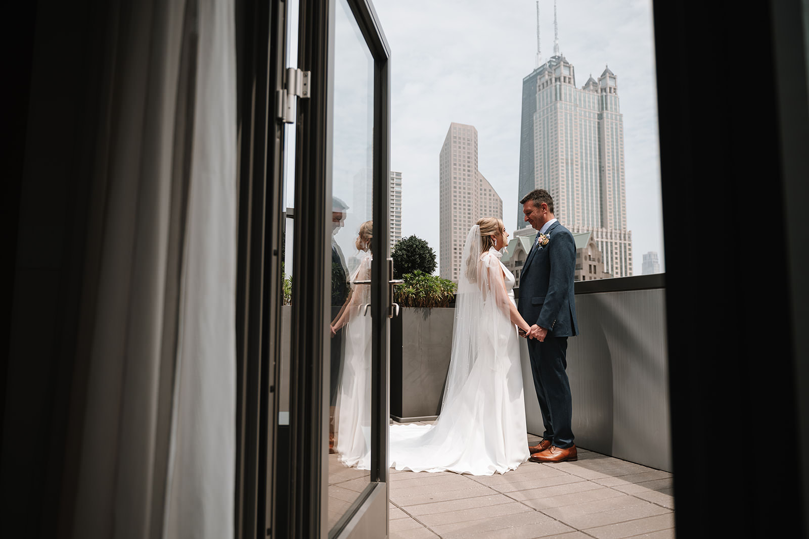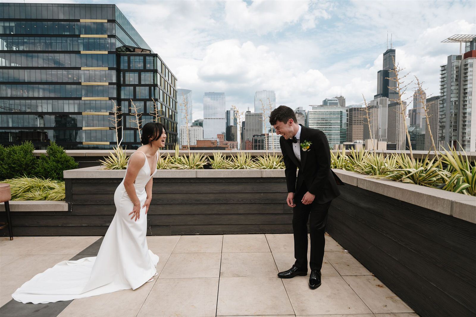 The Emily Hotel is one of the most popular West Loop Chicago wedding venues for couples who love modern design and candid, editorial photography. The getting ready spaces are clean and stylish with beautiful natural light, which sets the tone for the entire day. The Selva Rooftop adds another layer with greenery, skyline views, and Fulton Market energy.
